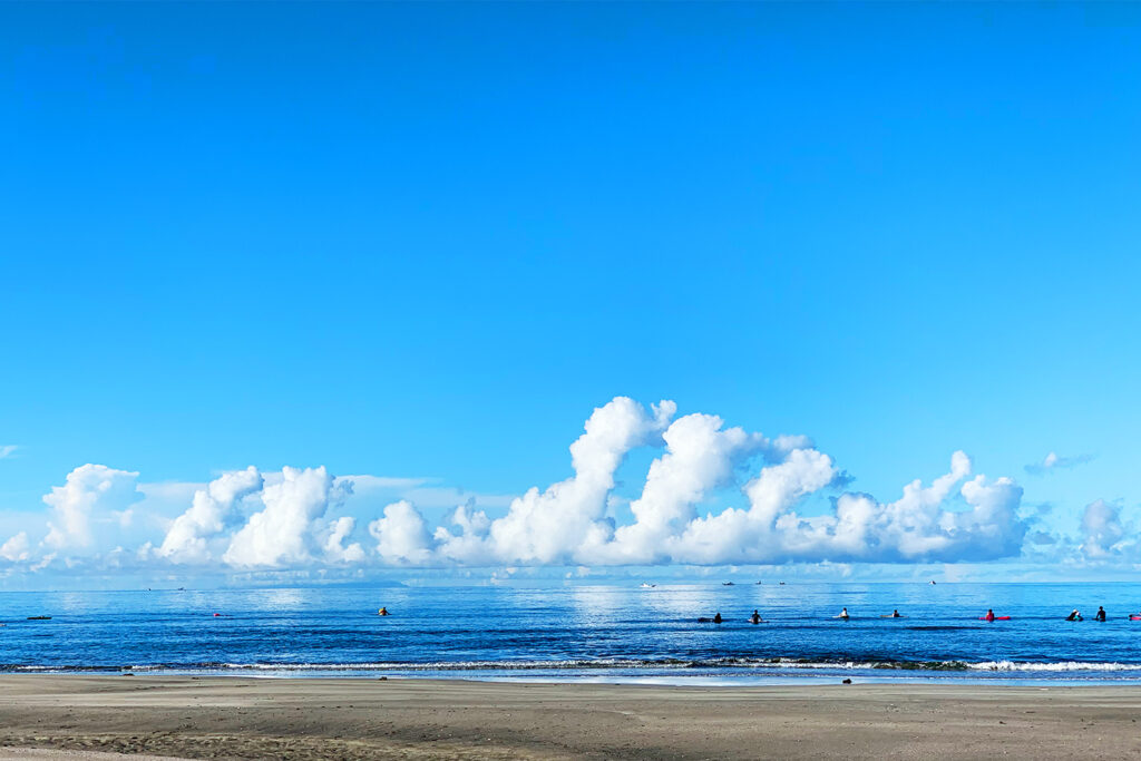 美味しいコーヒーで満たされたら、そのまま海へ向かって数分走ります。すると、目の前にバーン!と広い空と「由比ヶ浜」が広がります。
