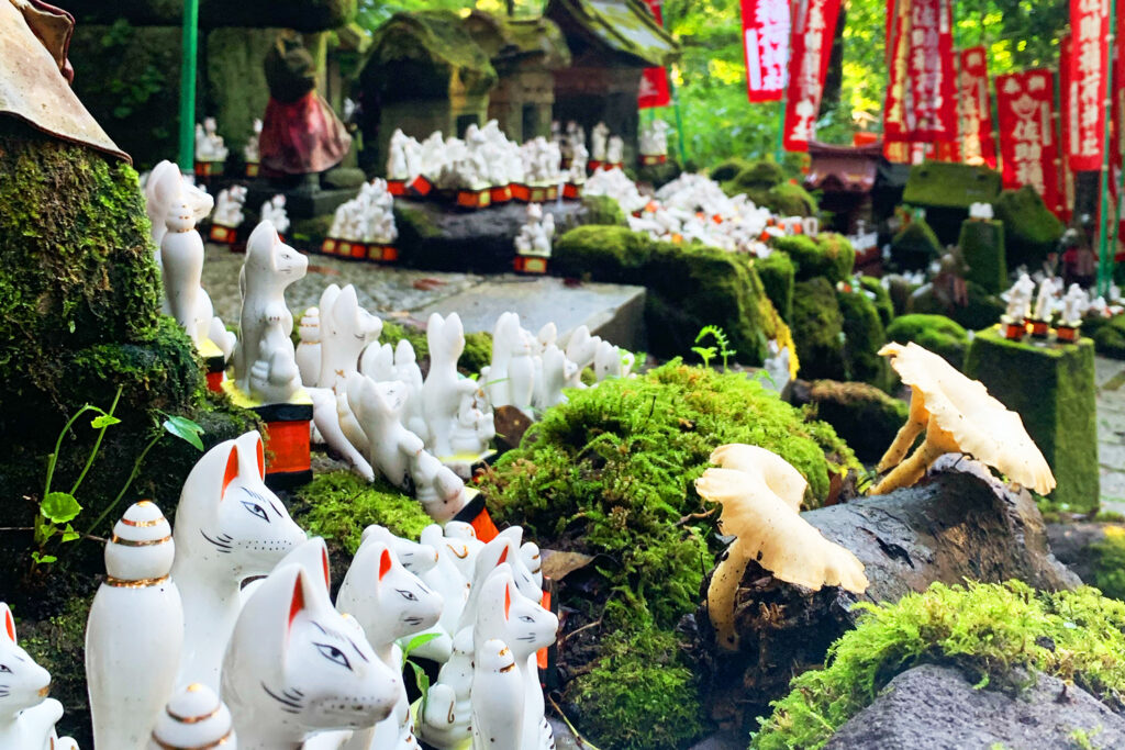 銭洗弁財天へと続くメインルートから少し脇へそれると、ひっそりと現れる入り口。そこから山肌に沿って無数に並ぶ赤い鳥居の列は、圧巻の一言です。鳥居をくぐり、苔むした境内の奥へ進むと、そこら中に置かれた白い狐の像が出迎えてくれます。