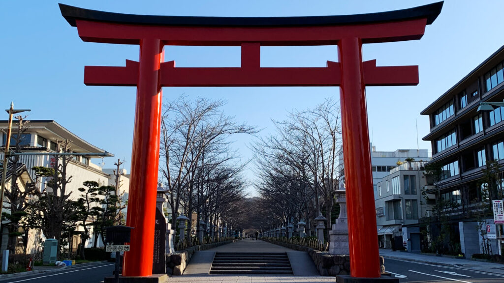コース説明など終えたら、スタート地点の鶴岡八幡宮・二の鳥居へ移動します。鳥居をスタートゲートに見立てて出発します。
