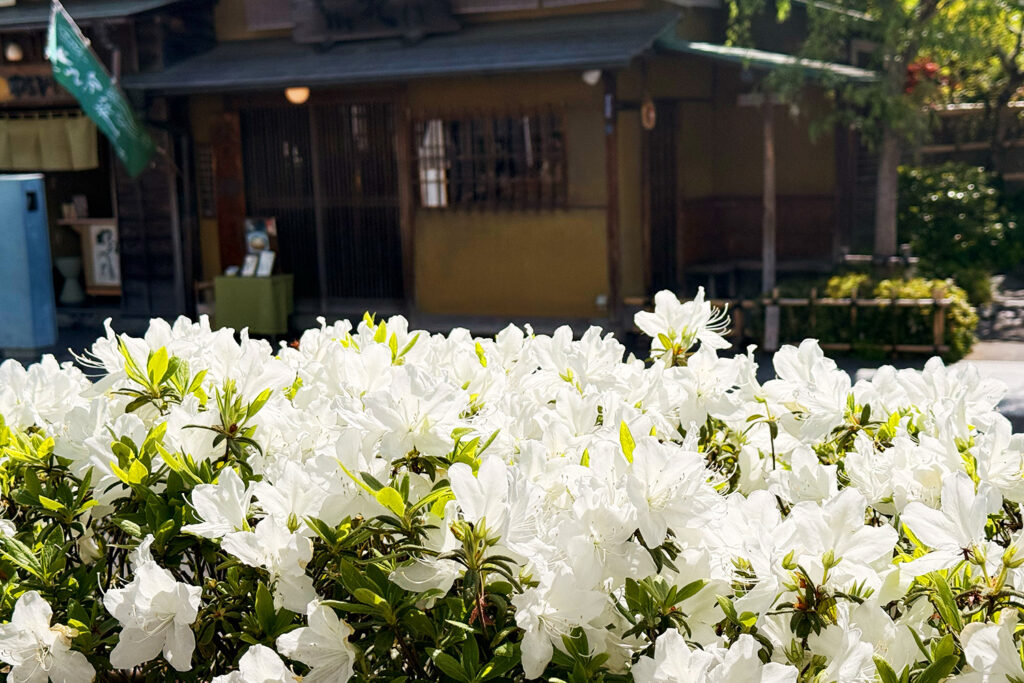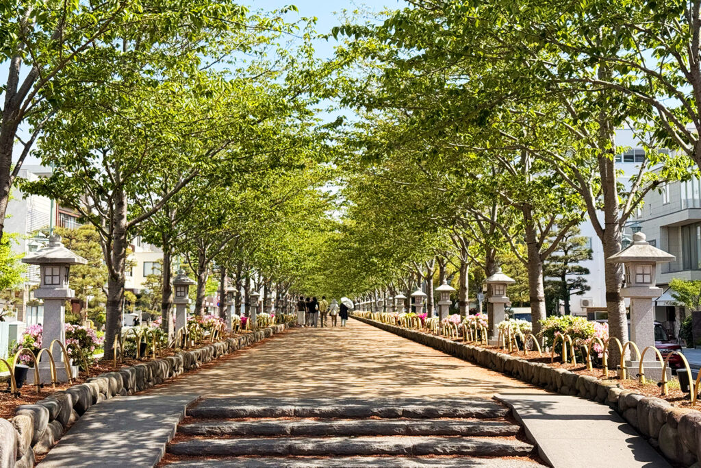 スタート地点の鎌倉駅から、まずは鶴岡八幡宮へ続く「段葛(だんかづら)」を通り抜けます。桜の季節が終わり、生き生きとした新緑へとバトンタッチしたこの時期は、色鮮やかなツツジが満開を迎え、私たちの目を楽しませてくれます。