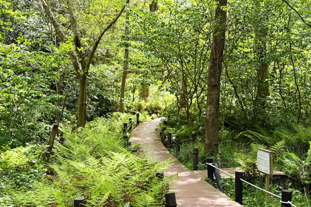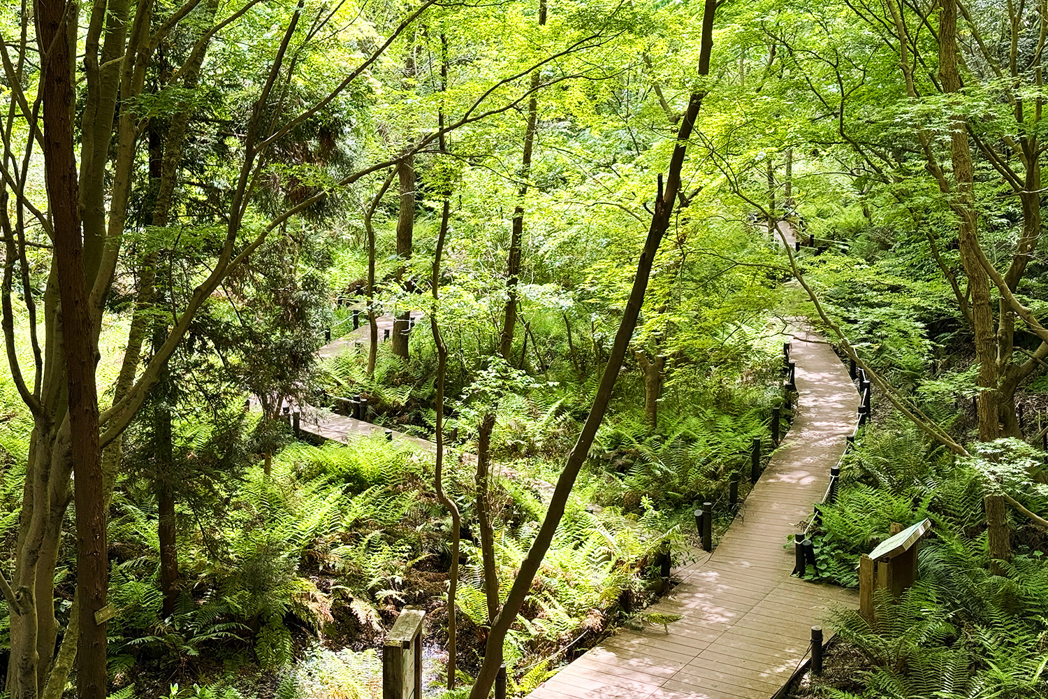 両脇を埋め尽くすほどの大きなシダ植物が群生し、まるで絵本の中の別世界に迷い込んだかのよう。深い緑に包まれた谷の中には、綺麗に整備されたウッドデッキの道がスッと伸びています。 普段の生活では絶対に出会えないこの神秘的な景色は、まさに「癒やしのトレイル」の真骨頂です。