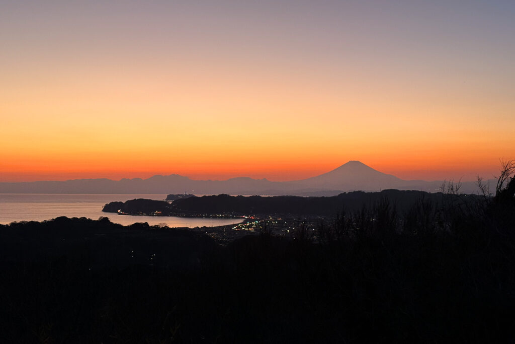 パノラマ台に到着した頃には、空にはクッキリとした富士山の影、そして足元にはキラキラと輝く鎌倉の街の夜景が。 「動くたびに景色が良くなっていく!」と参加者の皆さんも大興奮。ナイトハイキングだからこそ出会える、宝石箱をひっくり返したような景色を独占しました。