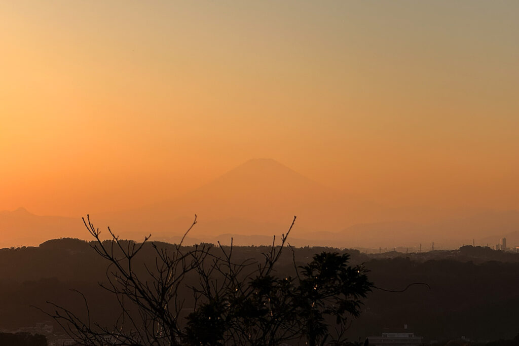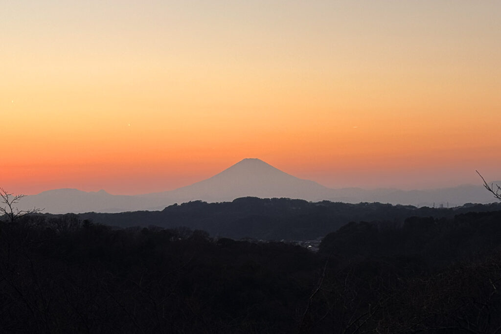 衣張山の山頂に到着すると、空はちょうど見事な茜色に。 富士山はうっすらとシルエットが見える程度でしたが、その淡いグラデーションが逆に幻想的で、一同しばし言葉を失って見惚れてしまいました。