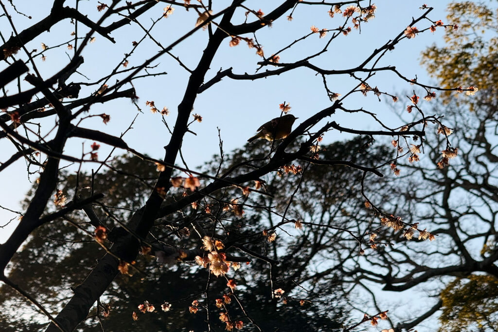 境内では早咲きの梅がふんわりと香り、春の訪れを感じさせてくれました。枝先には梅の花を楽しむウグイスの姿も。そんな「春の使者」を写真に収め、幸先の良いスタートとなりました。ここから住宅街の路地を抜け、衣張山(きぬはりやま)へとアプローチしていきます。