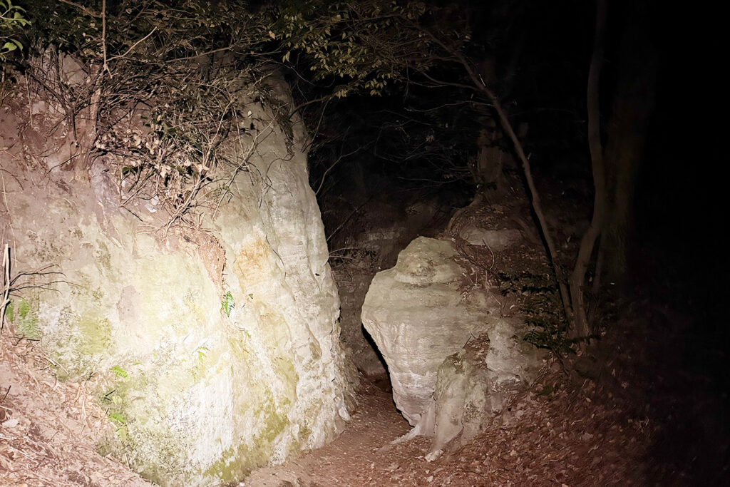 山道に入ってまず現れるのが、迫力ある「石切り場」の跡。 薄暗くなり始めた森の中で見る巨大な岩壁は、まるで映画のセットのよう。参加者の皆さんも「おぉ、探検っぽい!」と、ナイトハイクならではのワクワクした表情に変わっていきます。