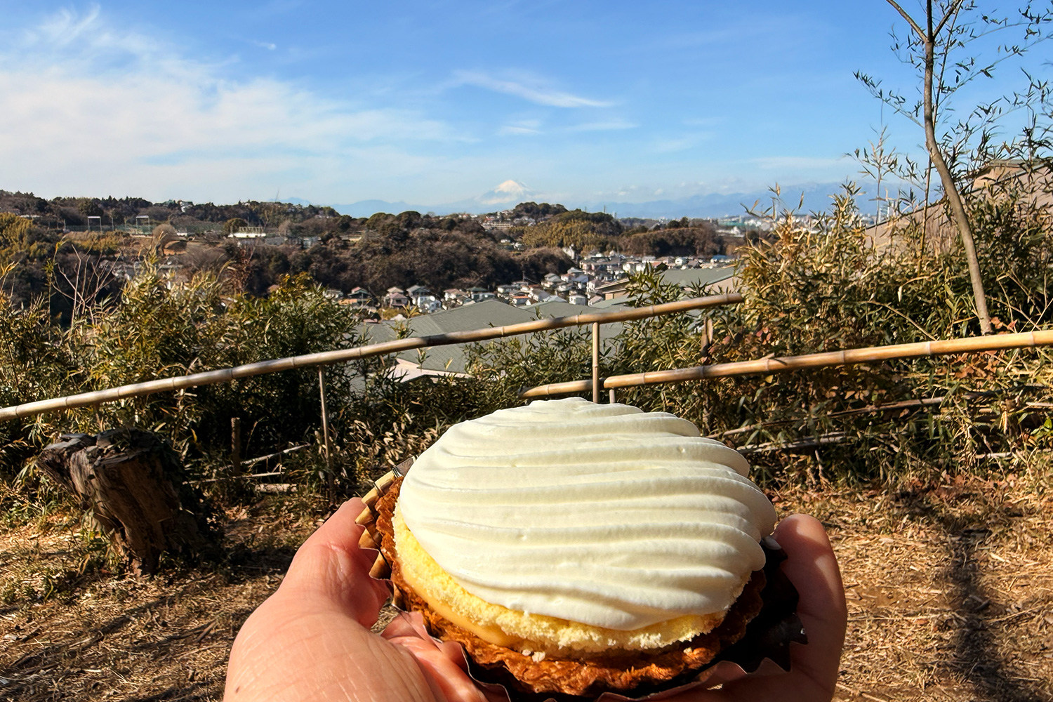 到着したのは、富士山がドーンと見える峯山近くの特等席。 ポカポカの日差し、目の前には雪化粧した富士山、そして手元には絶品のレモンパイ。