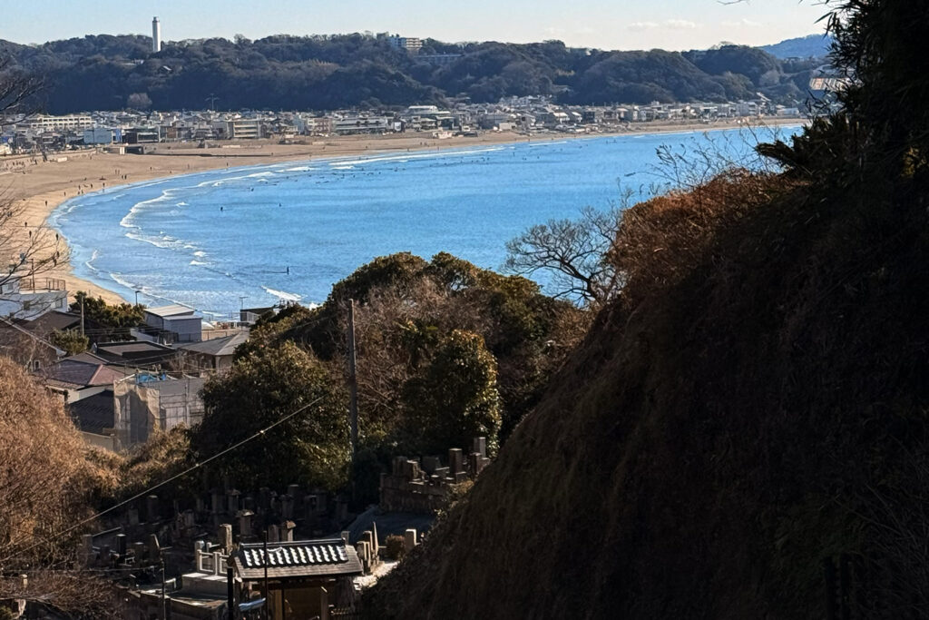 階段を登りきった先で振り返ると、眼下にはキラキラと輝く由比ヶ浜の海! 「わぁ、海だ!」と思わず声が上がる瞬間です。 有名な観光地も良いですが、こうやってふとした瞬間に海が見える場所こそ、鎌倉の本当の美しさが詰まっている気がします。