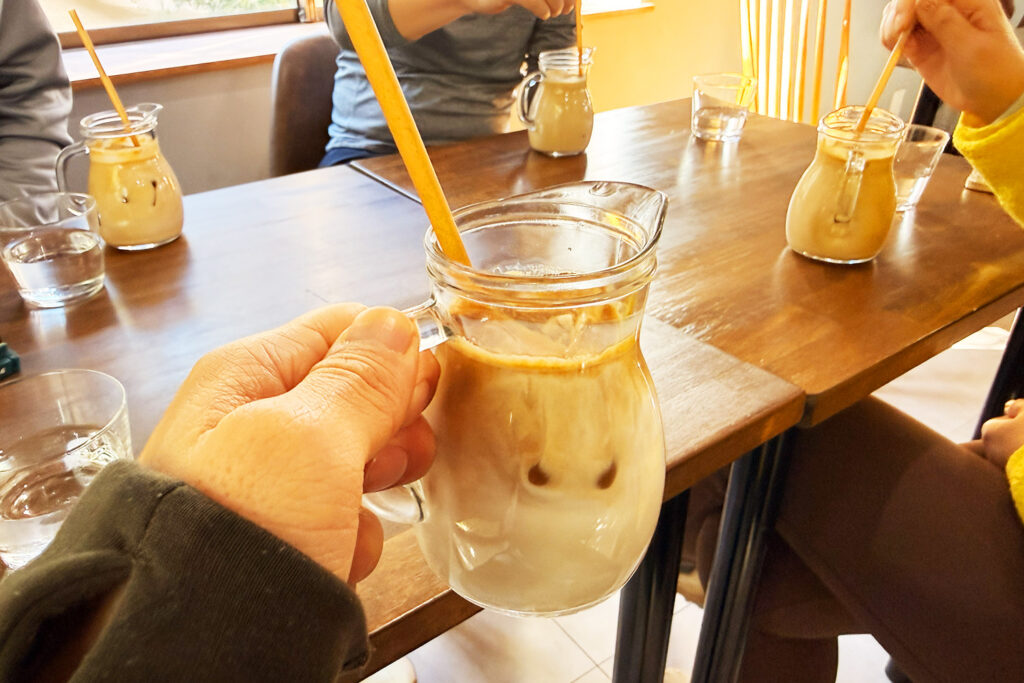 入店した時は「温かいものを」と思っていたはずが、日差しの暖かさと運動の熱気で、みんな揃って「アイスカフェラテ」を注文(笑)。 CHEEERS COFFEEさんのラテは、コクがあって本当に美味しいんです。