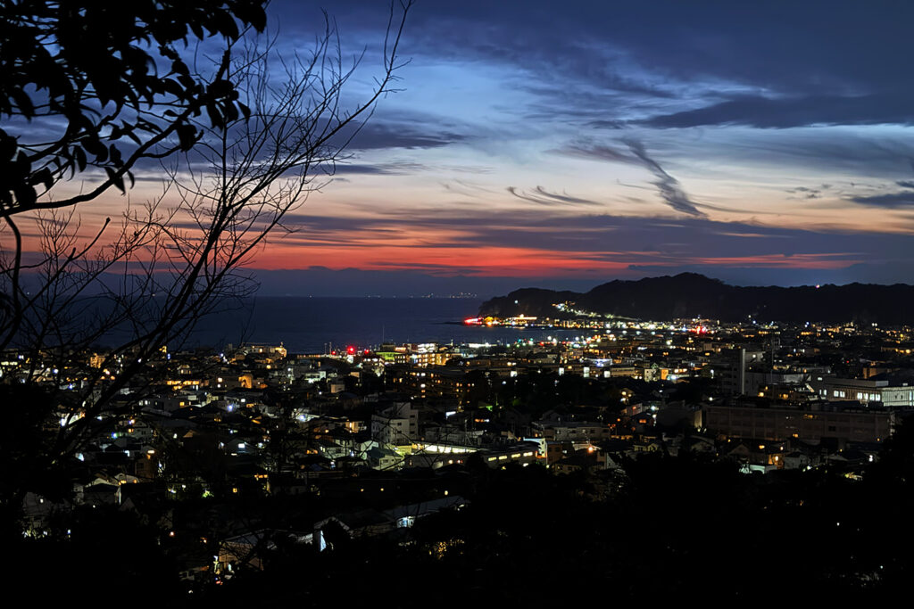 自分の足元だけを照らして進む集中力と、静寂。そして、視界が開けた瞬間に飛び込んでくるのは、眼下に広がる鎌倉の夜景です。