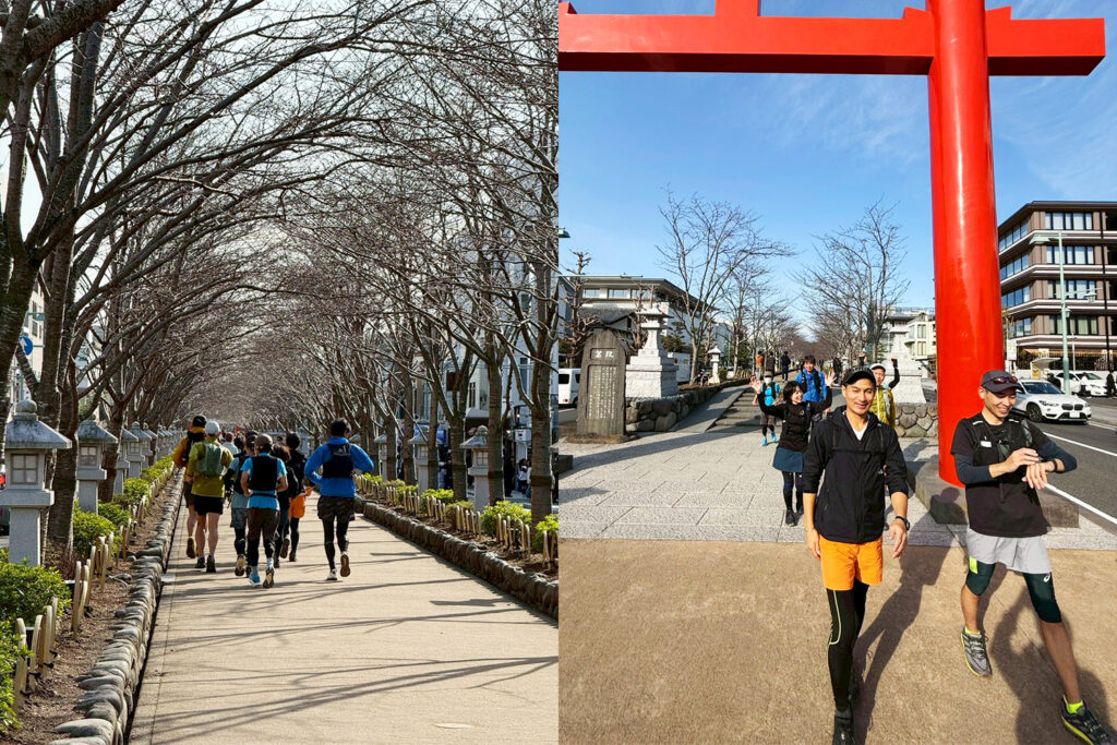 鶴岡八幡宮まで戻ってきたら、最後は「段葛(だんかずら)」をゆっくりウィニングラン! 朝出発した「二の鳥居」へと帰り着き、まずはハーフ(26km)の皆様が最高の笑顔でゴールテープ(鳥居)を切りました。本当にお疲れ様でした!