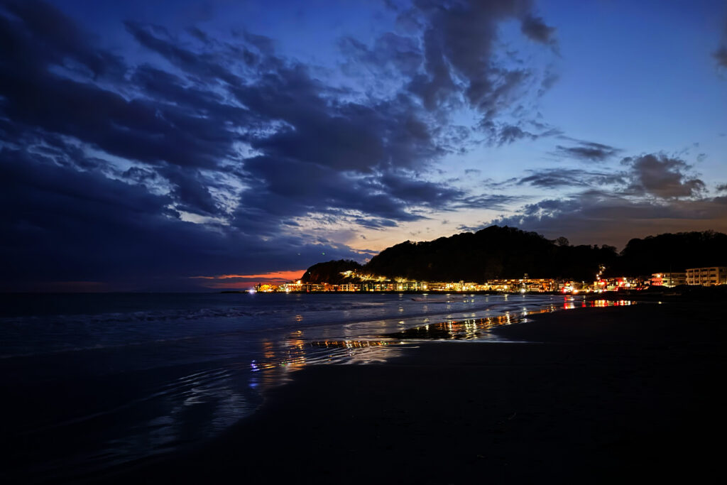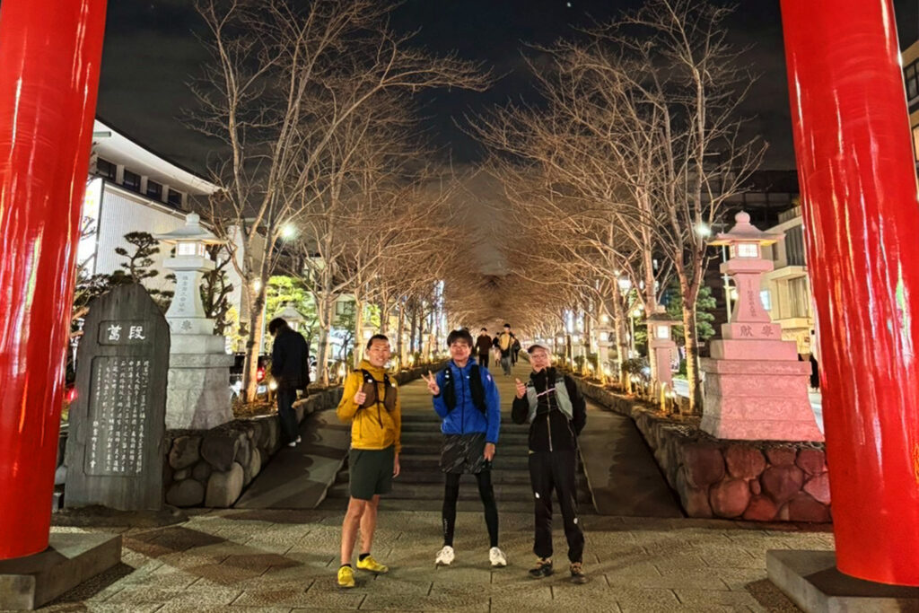 すっかり日が落ちたラストは、波の音を聞きながら海沿いの国道134号線を走り、由比ヶ浜ではビーチの砂浜へ! 砂浜をザクザクと駆け抜け、若宮大路のロードを最後の力を振り絞って進み、すっかり暗くなった「二の鳥居」に全員無事でフィニッシュしました!