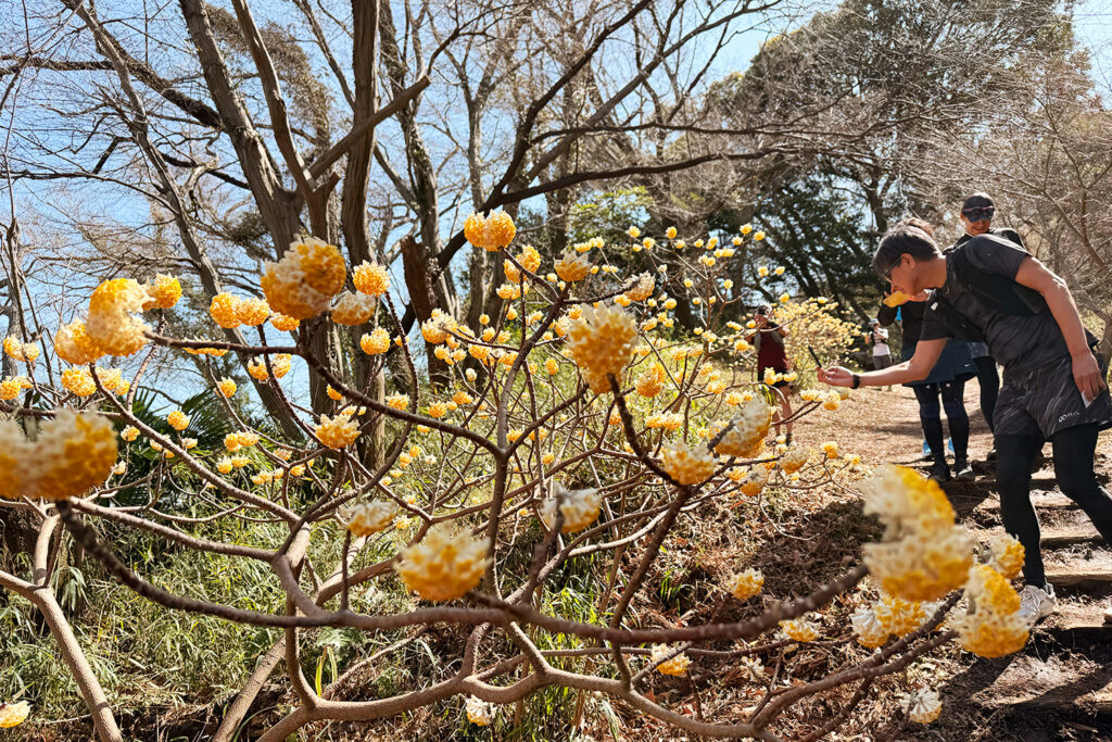 六国見山を抜けるルートでは、春を告げるミツマタの花が満開に!木漏れ日に透ける鮮やかなイエローが、静かなトレイルを美しく彩っていました。