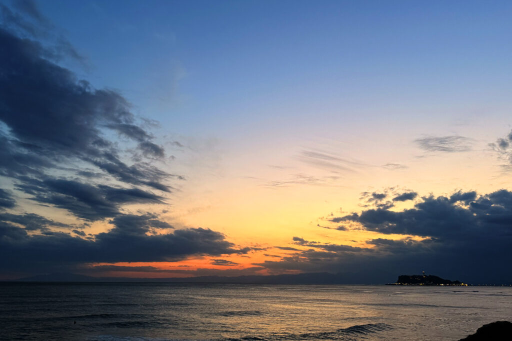 峯山から鎌倉山を抜け、いよいよ海へ向かって一気に下っていきます。 皆様のペースメイクが完璧だったおかげで、想定よりも早く、ヘッドライトを使わずにトレイル区間をコンプリート! 稲村ヶ崎の公園に到着した瞬間、目の前には綺麗な夕焼けと海、そして遠くに江ノ島が浮かぶ、過酷な旅のフィナーレにふさわしい絶景が広がっていました。