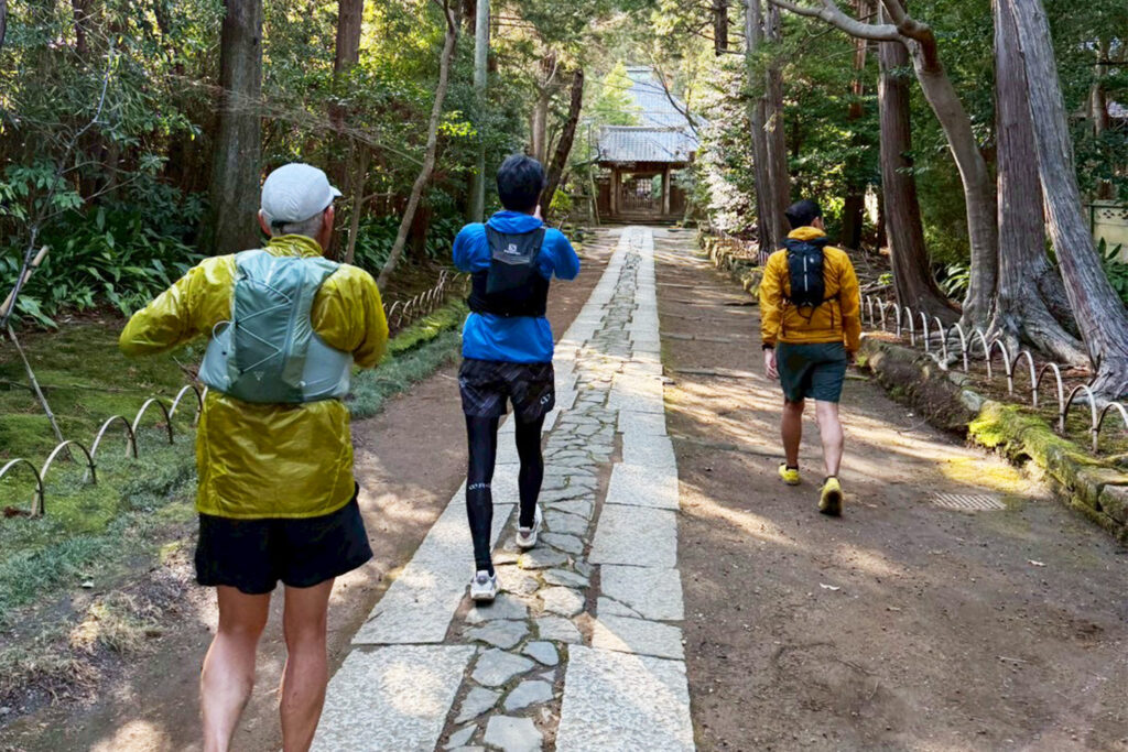 「二の鳥居」を出発し、いざトレイルへ。動き始めるとすぐに汗ばむほどのぽかぽか陽気で、皆さんと「暑いですね!」と笑い合いながら、早々に半袖・短パンのスタイルに変身しました。